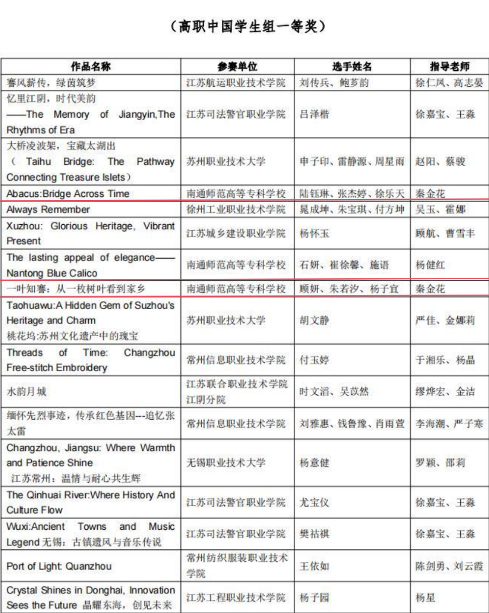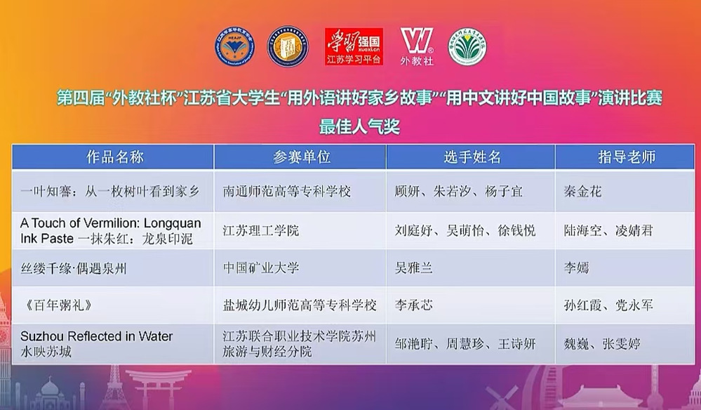 10月23日,短视频大赛暨第四届“外教社杯”江苏省大学生“用外语讲好家乡故事”、“用中文讲好中国故事”演讲比赛获奖名单公布,初等教育学院杨健红老师指导的石妍、崔徐馨、施语团队以及秦金花老师指导的陆钰琳、张杰婷、徐乐天团队和顾妍、朱若汐、杨子宜团队均获得一等奖。其中,顾妍、朱若汐、杨子宜团队的作品“一叶知謇:从一枚树叶看到家乡”还获得最佳人气奖。