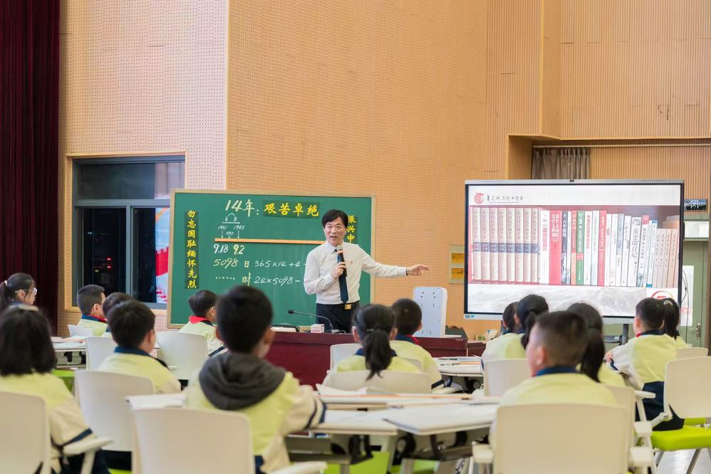 近年来,华老师指向数学课程中的爱国主义教育,创作了许多精彩的“国数”课。本次活动带来的是《14年:艰苦卓绝》。讲好抗战故事,传统路径多依赖于历史人文叙述和情感渲染升华,而华老师的高超之处是让数学成为叙事主角。在这节课中,华老师以14年抗战的艰苦卓绝为情感底色,以“抗日战争打了多少日”为核心话题,带着儿童借助米尺进行数学推算,深入体会14年抗战的“度日如年”,润心无声地带领儿童体悟抗战精神。整节课将严谨的数学推算与厚重的历史回溯融合一体,在具象化的数学实践中“勿忘国耻、缅怀先烈,振兴中华、珍爱和平”的情感熏染水到渠成。星河小学的孩子们参与积极、思维活跃。华老师精妙绝伦的教学运行、充满智慧的细节处理、温润如玉的人格魅力、工整美观的板书展示赢得了满堂喝彩。授课之后,华老师做了《传扬抗战精神 铸就“国数”长城》的专题报告。他声情并茂、妙语连珠,和大家一起分享了“国数”课的内涵以及他与他工作室的老师们创作国数课的每个精彩点滴。