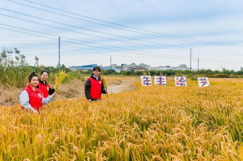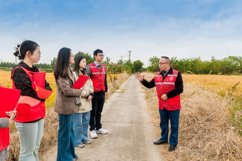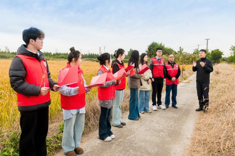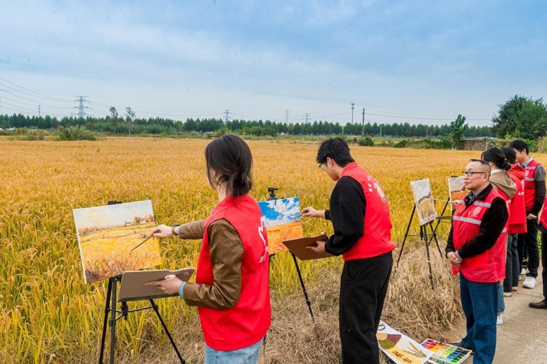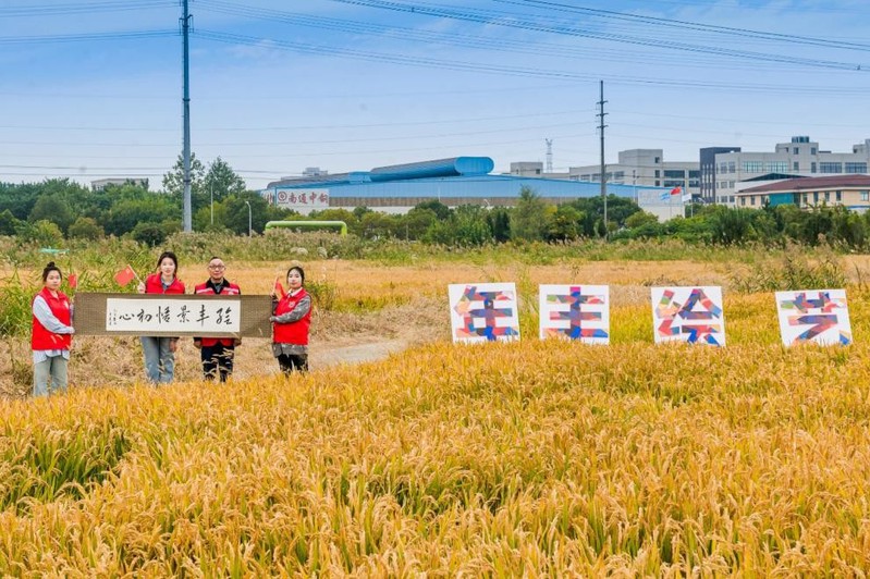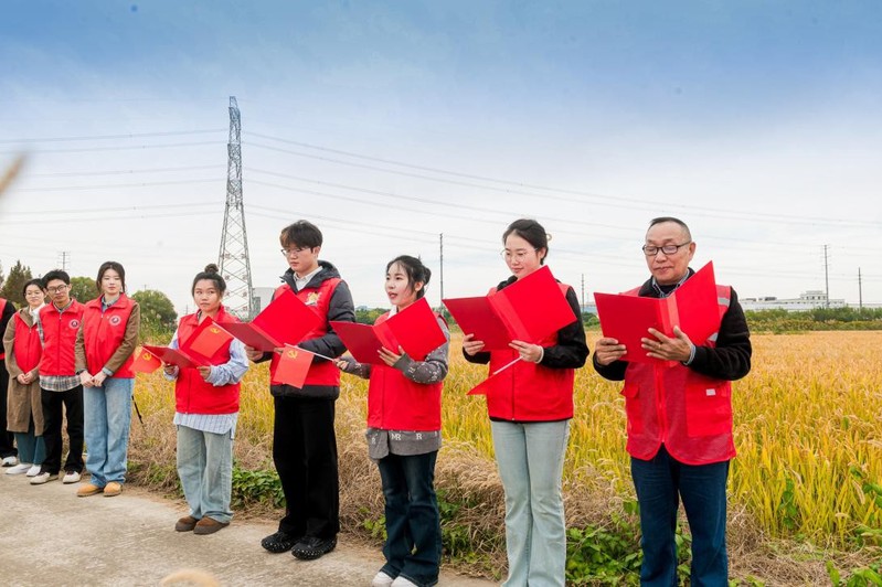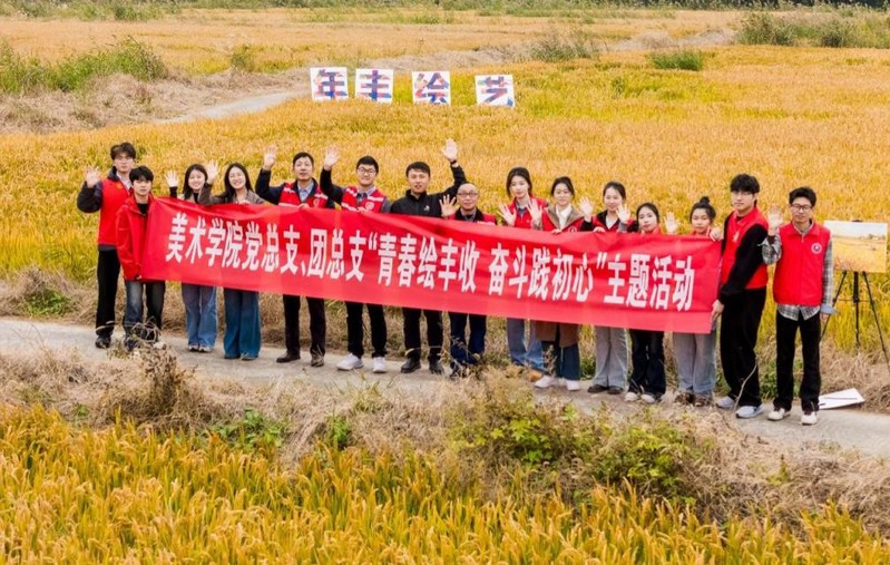 金秋送爽,稻谷飘香。为进一步深化校地合作,推动美育与思政教育深度融合,2025年11月4日上午,学院党总支、团总支与南通市崇川区天生港镇街道国庆村党委携手,在国庆社区5组的丰收田野间开展了“青春绘丰年 奋斗践初心”主题共建活动。国庆社区党委副书记施洋、友爱网格党支部书记陆涌建、家圆网格党支部书记严志林、我院党总支副书记许锐、辅导员张琦琰、宋帅楠以及学生党团员志愿者共同参与。