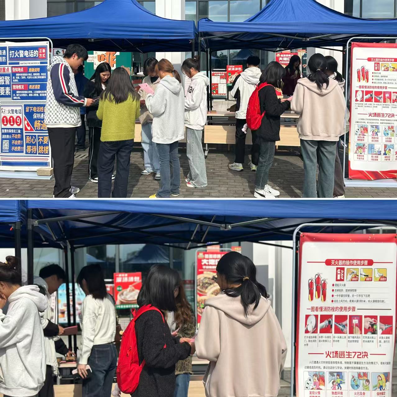 安全保卫处工作人员带领志愿者通过发放宣传资料、现场讲解等方式,向过往师生普及消防安全法律法规、火灾预防知识、初期火灾扑救方法以及火场逃生自救技能。