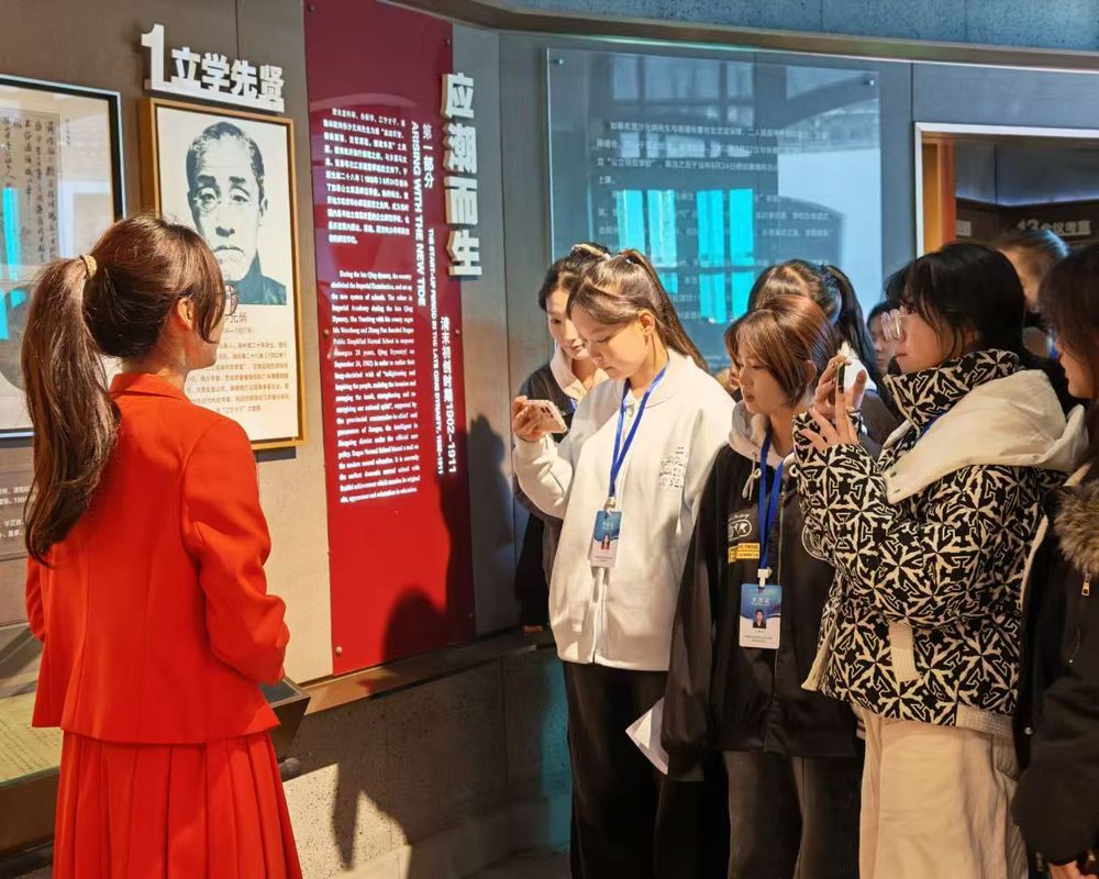 学院讲解员带领研学师生参观校园,探寻文化根脉,感悟红色与教育力量。作为校区标志性建筑,光绪门的古朴形制与办学初心介绍,让大家初触我校文化底蕴;驻足江海火种纪念墙前,红色故事讲解引导师生感悟革命精神;走进师范博物馆,史料文献展现我校师范教育发展脉络;最后在校史馆,时间轴与荣誉展品串联起学校办学历程,让研学师生对专业发展更有信心。