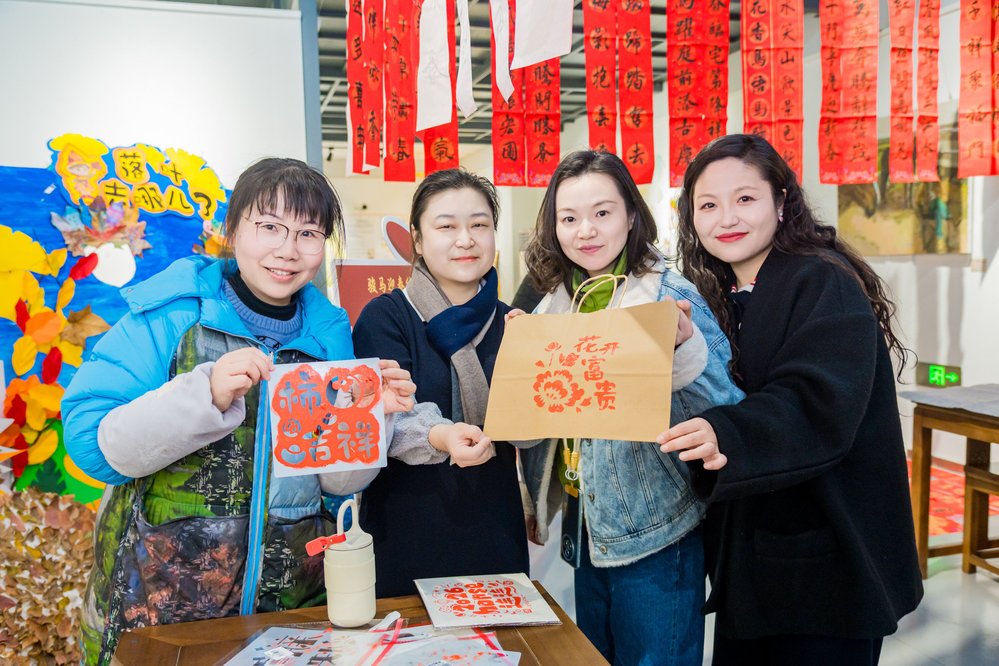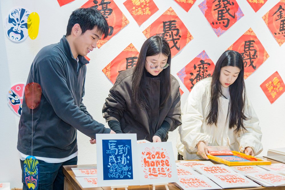 “手作文创”区同样热闹,教职工在指导下体验丝网版画印刷,亲手印制出“2026 horse(好事)连连”创意台历,让墨彩晕染出新年的好运;拓印“骏马送福”等主题福卡,用手作定格新年记忆。