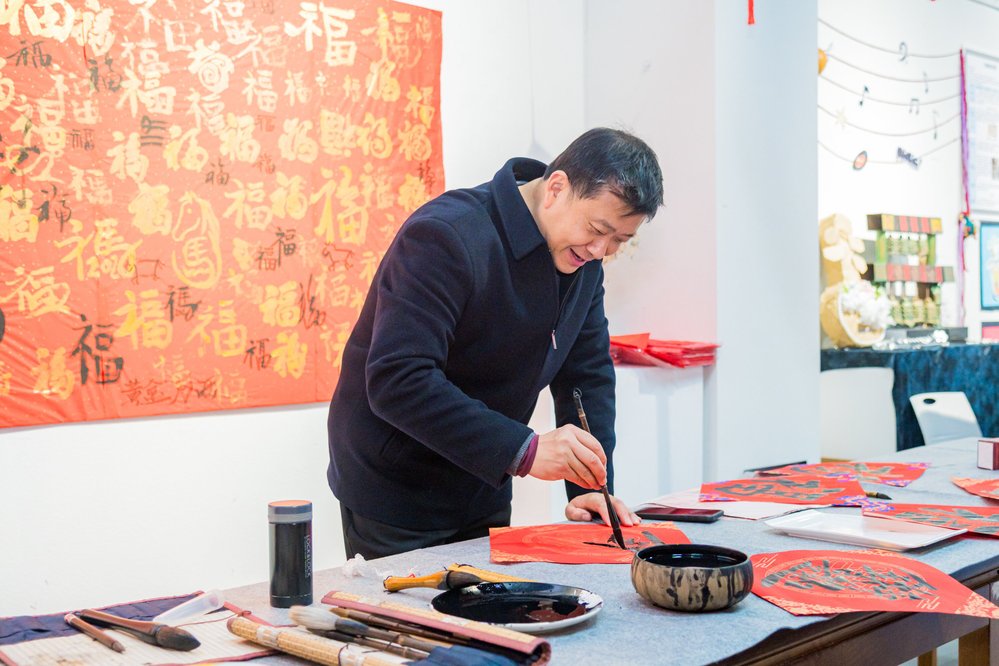 在“翰墨传福”区域,美术学院书法老师现场泼墨挥毫,笔走龙蛇,免费为教职工书写福字与春联。除“马到成功添锦绣,春回大地展宏图”等精选马年吉祥联外,不少教职工还自带五言或七言联内容,定制专属新春祝福。翰墨书香间,寄托着对新年最美好的期许。