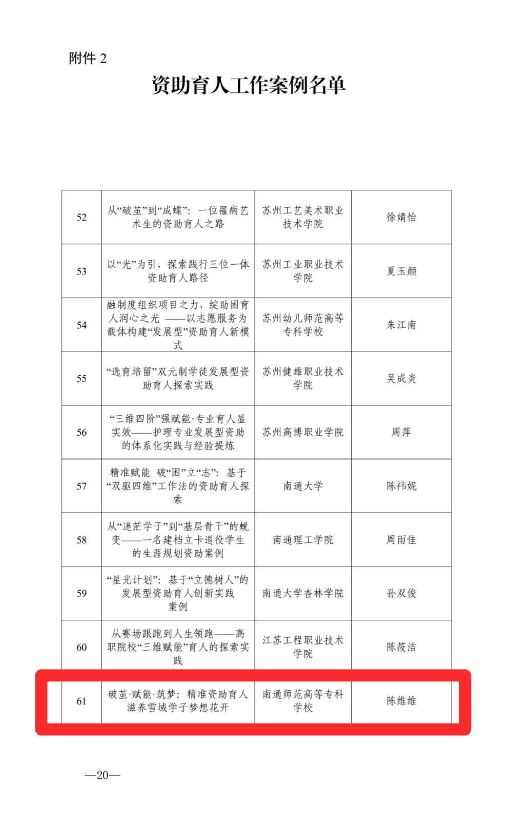 近日,江苏省教育厅公布2025年“苏乡永助”资助育人主题活动评选结果。经学校推荐、专家评审、结果公示,我校陈维维老师的工作案例《破茧·赋能·筑梦:精准资助育人滋养雪域学子梦想花》获评江苏省资助育人工作案例。