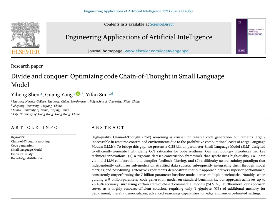 近日,我校智能信息学院沈逸恒老师联合国内科研团队的研究成果"Divide and Conquer: Optimizing Code Chain-of-Thought in Small Language Model"正式发表于人工智能领域国际权威期刊《Engineering Applications of Artificial Intelligence》2026年刊。该成果以南通师范高等专科学校为第一作者单位,实现了我校中科院一区Top期刊论文零的突破,标志着我校在人工智能轻量化模型与代码生成领域取得重要进展。