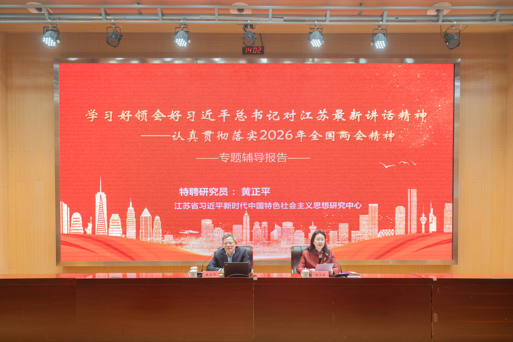 为认真学习领会习近平总书记在参加十四届全国人大四次会议江苏代表团审议时的重要讲话精神,精准把握2026年全国两会精神的核心要义,4月1日下午,我校在开发区校区图文信息中心小报告厅举办专题辅导报告会。党的创新理论传播专家、江苏省习近平新时代中国特色社会主义思想研究中心黄正平研究员应邀作专题辅导,为大家带来一场思想深刻、内容翔实的理论盛宴。校党委书记陈玉君主持报告会。