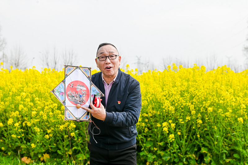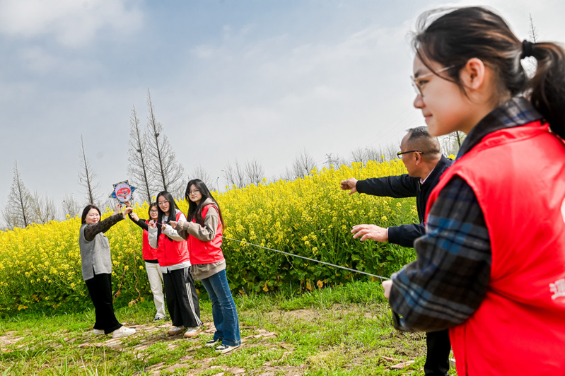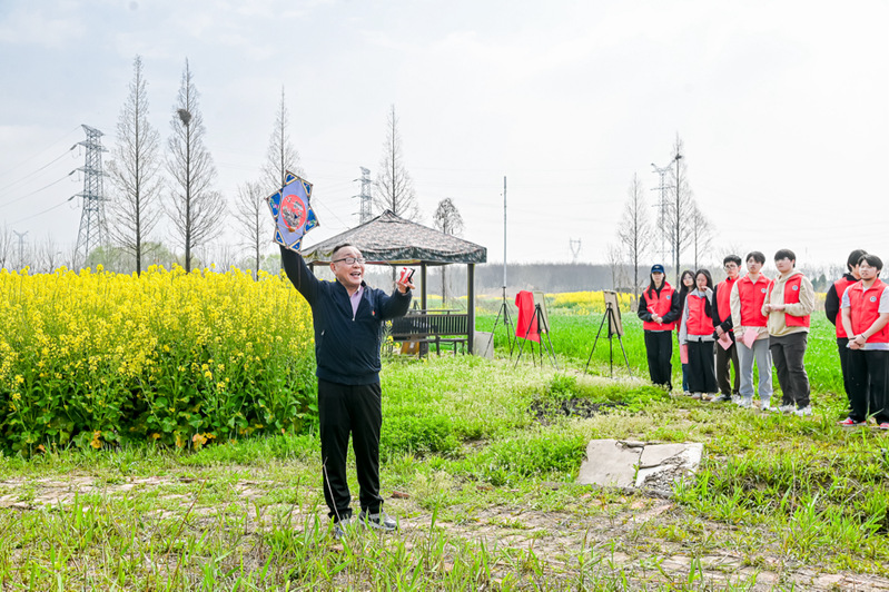 讲解过后,师生们携手放飞五彩板鹞,“八仙过海各显神通”的板鹞在花田上空翱翔,金黄花海为幕,缤纷纸鸢为景,师生们牵引风筝、欢声笑语,定格下非遗与青春共鸣的绝美画面。
