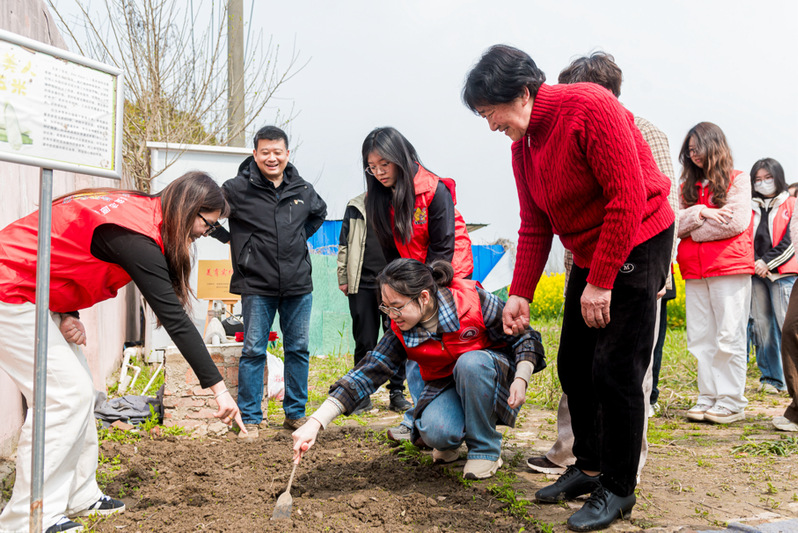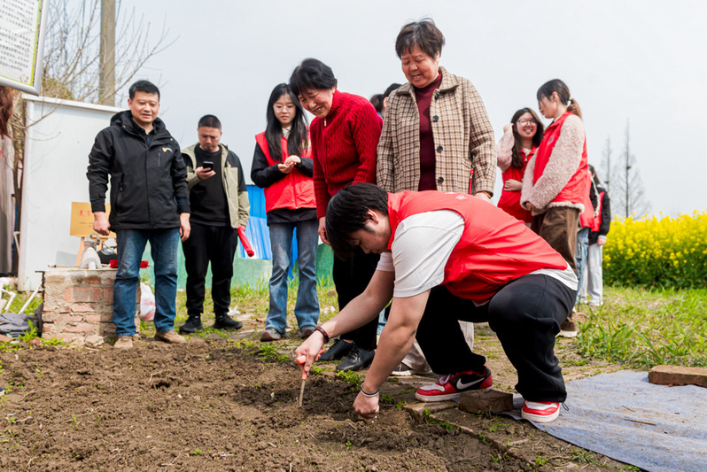 春种一粒粟,秋收万颗子。活动最后,“播种希望”劳动实践将现场氛围推向高潮,师生们在农户指导下挽起裤脚、拿起农具,亲手播种玉米,在泥土中挥洒汗水、种下希望,这场劳动实践不仅深化了美院与国庆社区的情谊,更让师生在劳作中感悟劳动精神、凝聚党团力量,以青春行动助力乡村振兴。