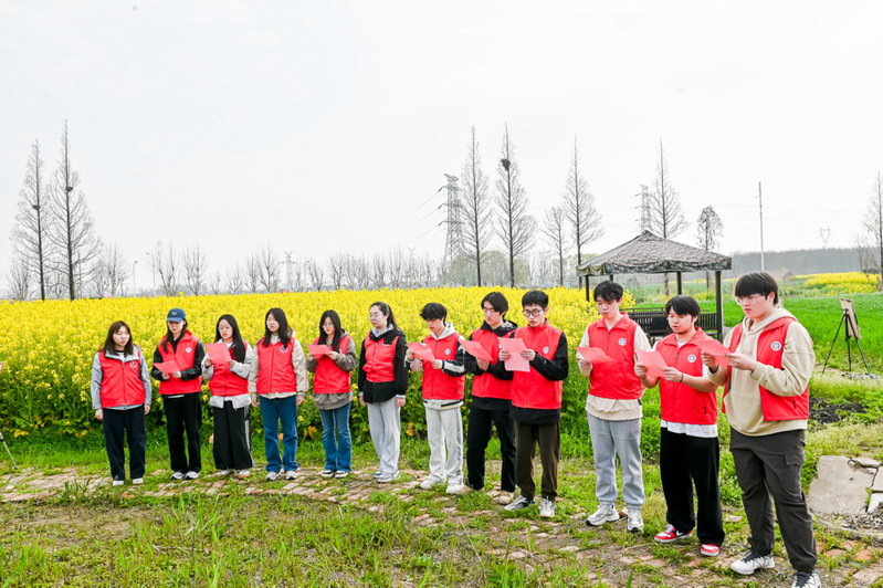 春之声环节,青春活力与田野生机相融。由我院学生代表和南通理工学院学生代表以大地为幕、天空为景,面向金黄花海,声情并茂朗诵《光荣啊,中国共青团》,以激昂之声传递信仰与担当,奏响青春主旋律。