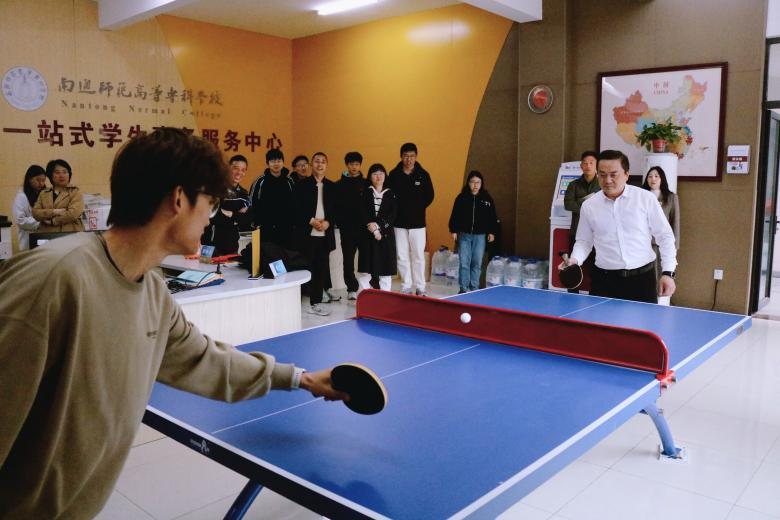 座谈交流后,活动进入“以动促健” 环节。王鑫明书记化身乒乓球 “教练”,与同学们同台切磋球技。小小乒乓球来回传递,拉近了师生距离,在运动中增进理解、凝聚共识,让交流更接地气、更有温度。