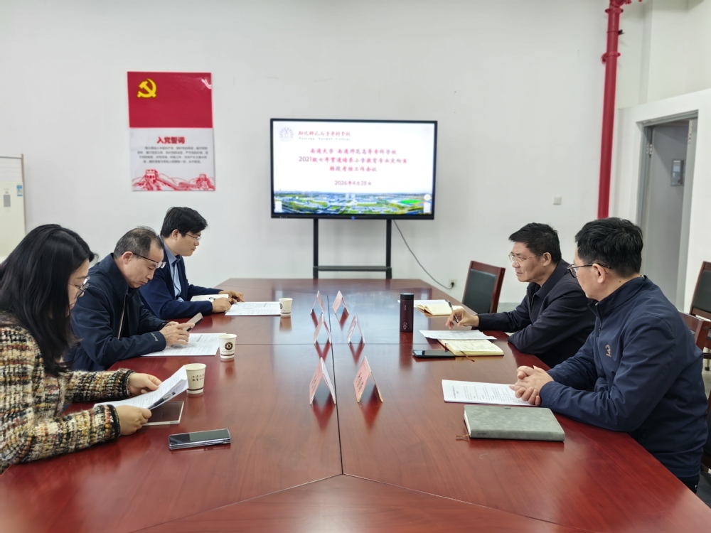 4月28日下午,南通大学与南通师范高等专科学校联合召开2021级七年贯通培养小学教育专业定向生转段考试工作会议,会议在我校开发区校区文昌楼412会议室举行。校党委委员、副校长张松祥,南通大学教育科学学院副院长张鹏程,我校教务处副处长姜黎鑫,初等教育学院院长张建平、副院长于国海等出席会议。会议由张建平主持。